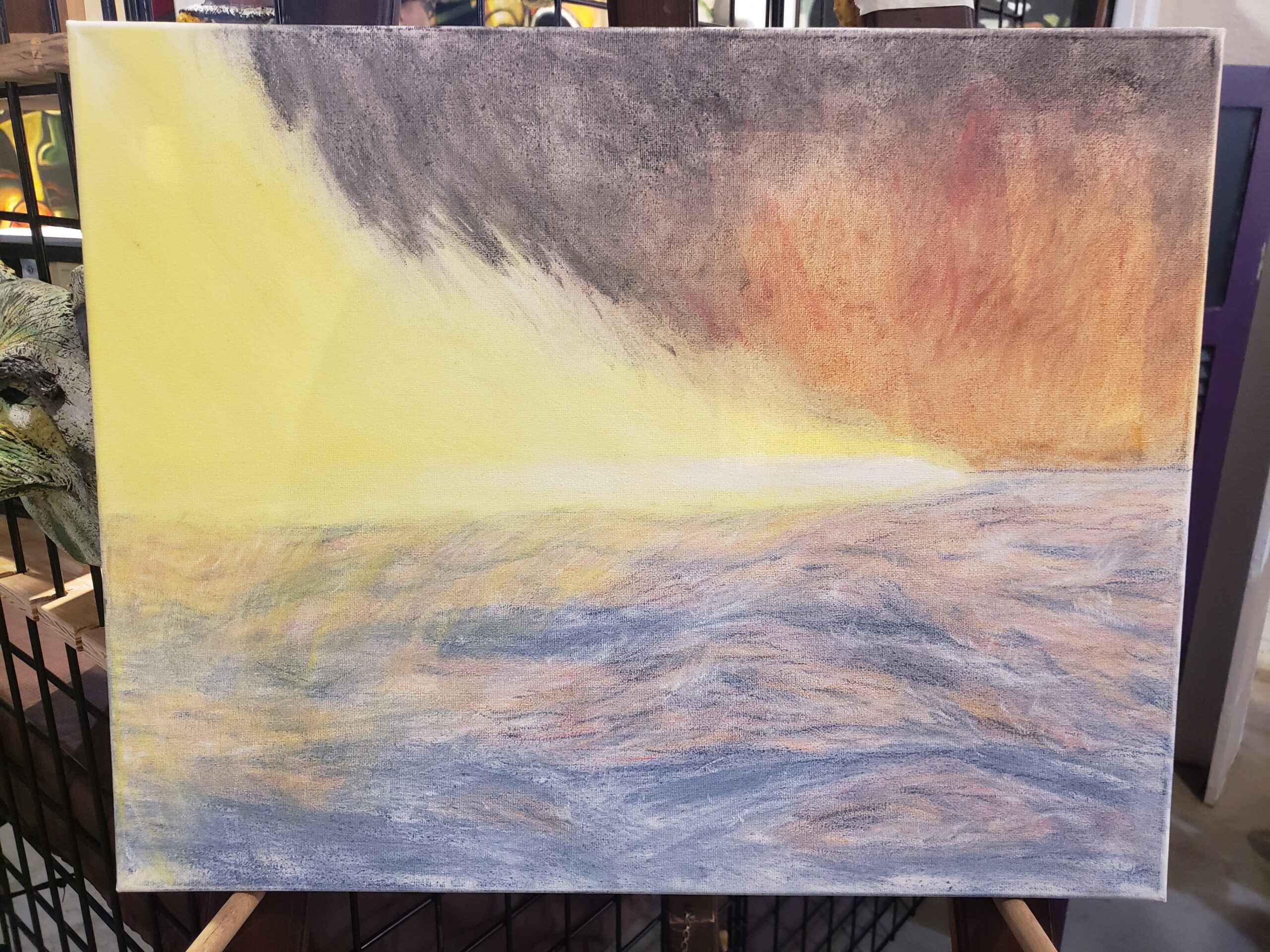 This pastel on white canvas work is based on the Biblical myth that was taken from Cannaanite myth, in which G-d or Ba’al depending on the source, is featured. In the older version, the storm deity defeats chaos, in the later version it is said to be part of the creation of the world.